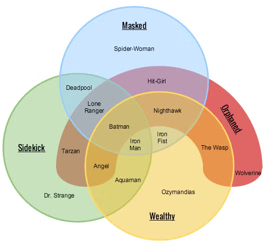 A tri Venn diagram — in which all sets have some overlap with each other — starts to get more complicated. You end up with seven distinct sections, including the center, which covers the union of all three sets: