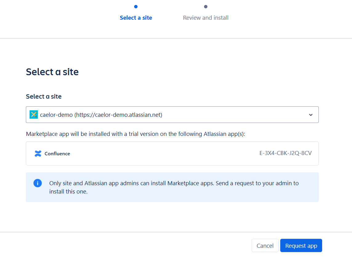 After completing these steps, your Confluence administrator will have the opportunity to review your request and start a free evaluation, purchase the app, or decline your request.